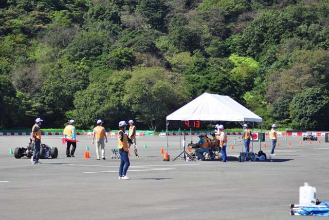 7日上午,车手经过几次简单的练习之后,队伍即赶赴直线加速比赛现场参加第一项动态比赛,以轻量化、强劲动力为特点的我校参赛赛车在75米直线加速中取得了4.129秒的好成绩,比去年参加中国赛的4.92秒有了显著提升,同时刷新了日本赛此项目9年来的纪录。我校参赛队也成为历史上第一支获得国际大赛单项冠军的中国车队,而且由于我校的优异成绩,使得共计30余支参赛队此项得分只能在基础分3.5分以下。这让第一次参加日本赛的北理工方程式长安车队一时成为了众人关注的焦点。