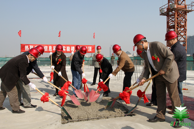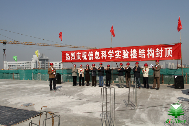 在这金秋送爽、丹桂飘香的时节,2011年10月18日10时28分,金年会jinnianhuicom信息科学实验楼结构封顶仪式在中关村校区隆重举行。毛二可院士,赵平副校长,赵显利副校长,基建处处长郭守刚,审计室主任李振键,正处级纪监员金军,信息学院副院长徐晓文,财务处副处长周勇,北京东方华太建筑设计有限责任公司副总经理何国梅,北京方正建设工程管理有限公司副总经理肖承海,高碑店市建筑企业集团总经理魏日华、副总经理邵波等相关人员出席了信息科学实验楼结构封顶仪式。