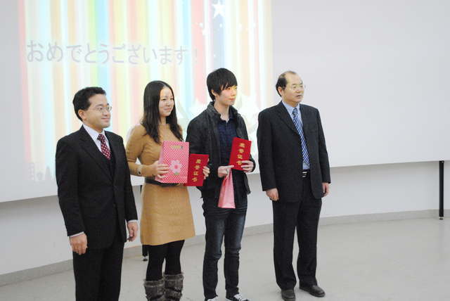 日本大使馆一等秘书柳泽先生(左一)和我校国际交流合作处王庆林处长(右一)为获一等奖选手颁奖。