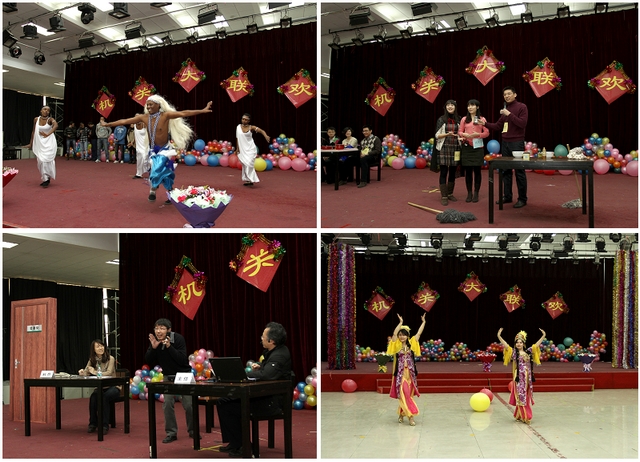 各个机关单位的处级领导也送上了新年贺词,并纷纷参与到了趣味游戏中,给全场带来了喜庆和欢乐的气息。经过精心的准备,各机关单位在联欢会上表演了丰富多彩的节目。如学校办公室表演了微型穿越短剧——武林外传,实设处上演了小品《设备处的故事》,学生工作处编排了民族歌舞串烧,教务处杨亚楠带来了美妙的独唱,留学生中心带来了异域风采。多样的形式,精湛的表演,满堂的笑声和感动,这个联欢会让大家忘掉了一年工作的辛苦,放松了心情,收获了快乐。联欢会还设有多个游戏环节和抽奖环节,让整个联欢会成为欢乐的海洋。