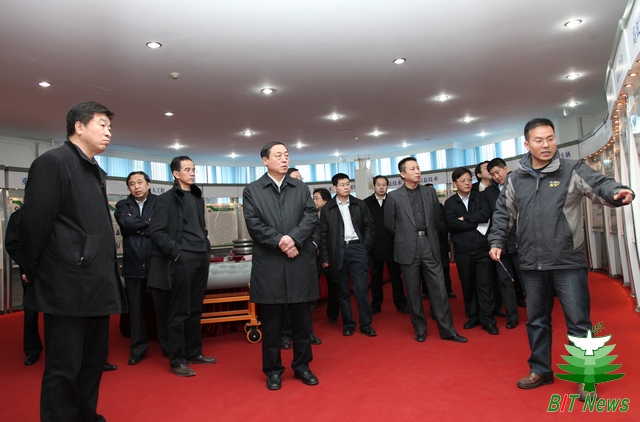 在逸夫楼科技成果展上,赵凤桐一行详细了解了我校科技创新平台、重大工程、制导技术、信息技术、装甲车辆等方面的建设发展情况及特色成果。随后,一行人参观考察了生命学院实验室和理工雷科公司。