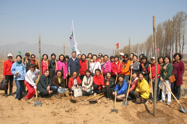 在副校长赵平的带领下,在女教授协会会长何海燕、校工会副主席王建光的积极组织下,36名女教授、学校机关管理人员和学生代表近70人参加了此次活动,一起在密云西田各庄植树区种下100多株“绿色希望”的杨柳。