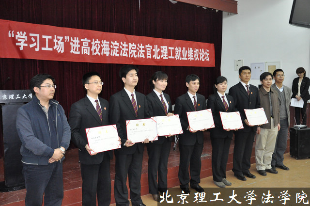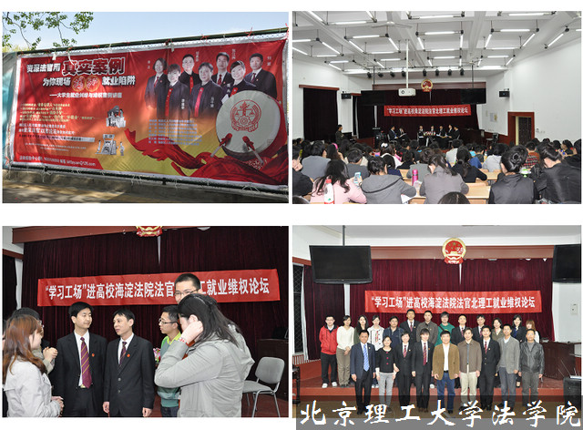 2012年4月11日晚,海淀法院劳动争议庭“学习工场”进高校活动之北理工就业维权论坛活动在7号楼108隆重举行,海淀区人民法院劳动争议庭庭长李盛荣法官、海淀区人民法院劳动争议庭副庭长马千里法官、海淀区人民法院劳动争议庭审判员聂冉法官、海淀区人民法院劳动争议庭审判员胡高崇法官、海淀区人民法院劳动争议庭审判员 张江洲法官、海淀区人民法院劳动争议庭审判员刘凯法官、以及海淀区人民法院劳动争议庭几乎全体法官和工作人员都做客北理工,与广大师生共同交流就业维权问题。