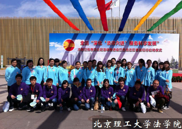 为积极响应校团委的号召,法学院分团委结合专业特点设计开展了本学院的“信仰•青春•阳光”系列活动。近日,法学院分团委统一安排、协调,由法律援助中心承办的“学雷锋普法志愿者”法制宣传教育系列主题活动于2012年4月12日正式启动,作为参与活动人数最多的一所高校,北理工法学院首批32名“学雷锋普法志愿者”,参加了在万事达中心举行的全国“深化‘法律六进’服务科学发展”——法制宣传教育主题活动推进会暨普法志愿者基层行启动仪式,这也标志着法学院普法志愿者系列活动正式启动。