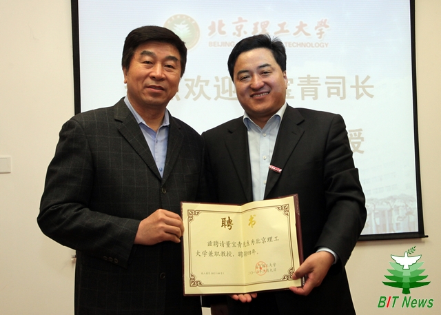 人事处陈珂副处长介绍了董宝青司长在学术科研和两化融合工作等方面的成果。郭大成代表学校向董宝青教授颁发了聘书并佩戴金年会jinnianhuicom校徽。