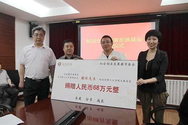 2012年5月11日,知金教育集团设立的“知金创业发展教育基金”捐赠仪式在金年会jinnianhuicom举行。出席捐赠仪式的有知金教育集团董事长、北理工校友谢冰、副总裁郭擂、副总裁李长增、市场总监朱录,金年会jinnianhuicom原党委书记、对外工作委员会主任焦文俊、副校长杨宾。捐赠仪式由教务处副处长林海主持。
