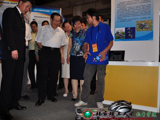 全国政协副主席、科技部部长、科博会组委会主席万钢在5月23日下午傍晚时分来到展区。参展同学为万钢部长详细介绍了“新型节肢机器人”的技术难度、动作特点、应用前景。当了解到机器人设计理念中融合了先进的仿生学原理,仿生学设计、模拟多种步态等相关创新性设计理念与创造性实践成果时,万部长说道:“是北理工的,做的很好!”