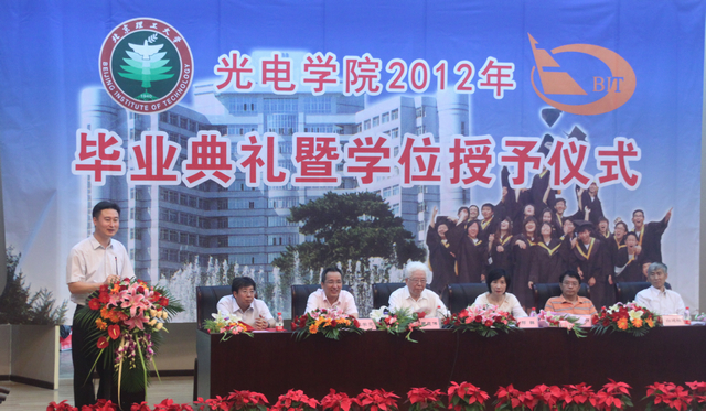 依依惜别多珍重,情系光电报国家。2012年6月17日下午,光电学院2012届本科生、研究生毕业典礼暨学位授予仪式在7号教学楼报告厅隆重举行。出席本次典礼的来宾和学院领导老师有:校友代表、公安部一所副所长陈学亮研究员,家长代表、校友、中国空空导弹研究院副总工程师白晓东研究员,光电学院周立伟院士,郝群副院长、赵长明副院长,光电信息工程专业责任教授、北京市教学名师白廷柱教授等部分老师和家长。毕业典礼由学院副书记、副院长邹锐主持。