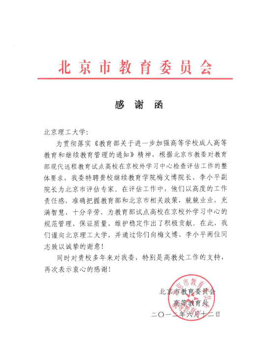 北京市教育委员会高教处感谢函