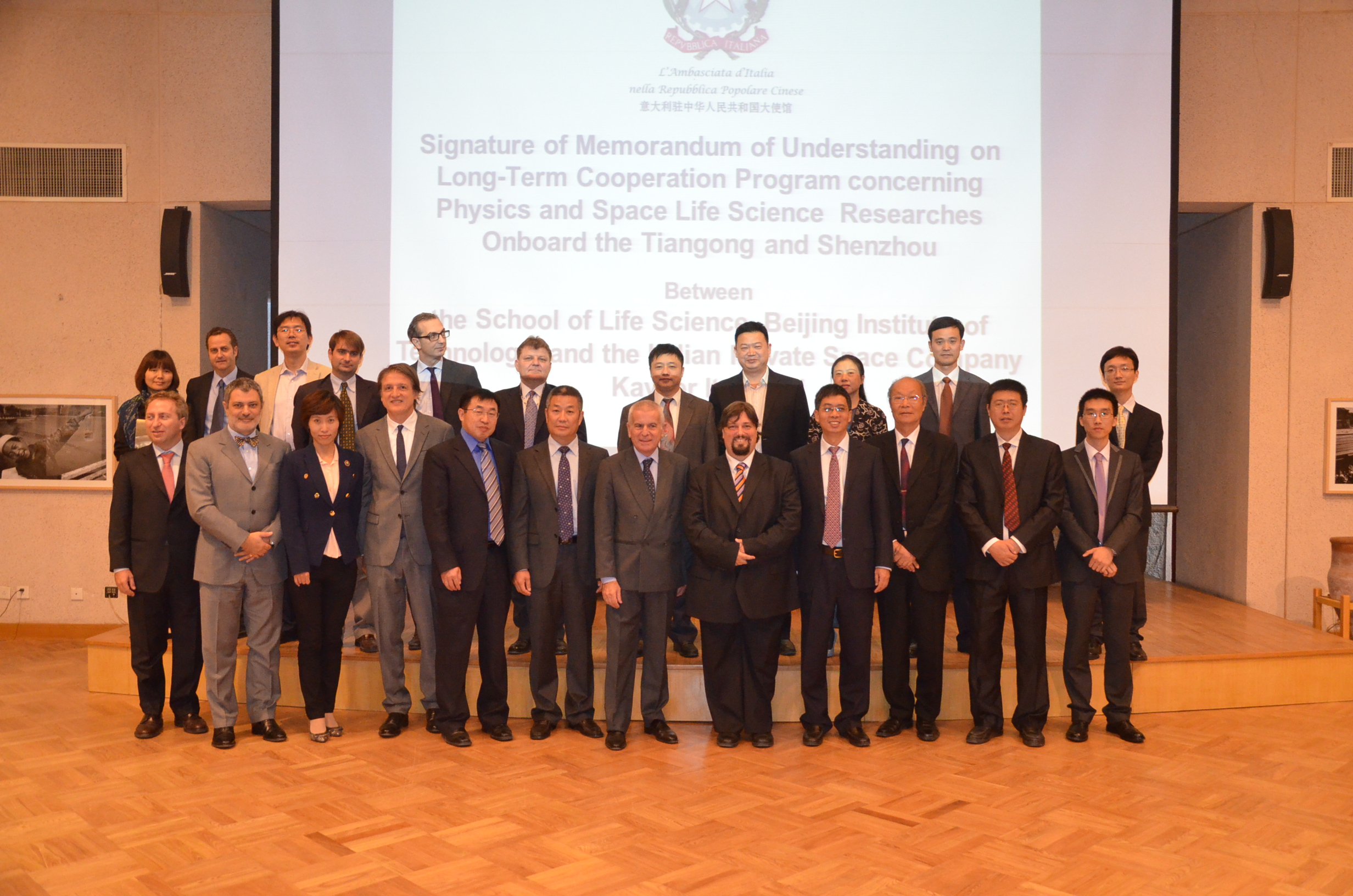 为了响应学校加强协同创新的指示精神,加强国际合作交流,推动生命学院特色和优势学科建设,同时也作为生命学院建院十周年重要活动之一,我校生命学院日前在意大利驻华大使馆与意大利Kayser公司签署了“金年会jinnianhuicom生命学院与Kayser Italia公司在空间生命科学领域长期合作备忘录”。应邀出席签约仪式的中方人员有:金年会jinnianhuicom赵长禄副校长,科技部国际合作司陈霖豪副司长,中国空间技术研究院钱学森实验室王立副总师,清华大学宇航学院人机环研究所所长李路明教授,北京航空航天大学生物与医学工程学院、国际宇航科学院院士庄逢源教授,中科院空间中心空间生命研究室翟光杰主任,金年会jinnianhuicom国际交流合作处副处长邢清清,生命学院院长邓玉林、党委书记李汉军、副院长唐晓英、副书记副院长周连景等;意大利方人员有:意大利驻华大使馆大使H.E. Attilio Massimo Iannucci先生,意大利驻华使馆工业与技术革新参赞Giuseppe Rao先生,意大利驻华使馆商务参赞Davide Giglio先生、Livio Spadavecchia先生,意大利驻华使馆一秘Alessandro De Masi 先生,Kayser Italia公司总裁David S. Zolesi先生等。