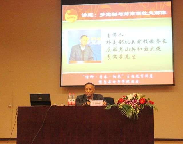 李满长大使结合自己的留学经历和长期从事外交工作的丰富阅历,从南斯拉夫的历史出发,讲述了南斯拉夫铁托时期经济迅猛发展的良好状况及西方国家从多方面对前南斯拉夫进行了和平演变使其走向分裂的过程,在对南斯拉夫前后的内外部政治形势行了详细分析后,指出多党制的仓促引进是导致南斯拉夫解体的关键原因。李满长大使认为,南斯拉夫解体的历史原因是多方面的。苏联解体、东欧剧变以及西方资本主义国家的和平演变是南斯拉夫解体的外部原因;而其解体的根本原因则在于南斯拉夫放弃一党执政,实行多党制。李满长大使指出,前南斯拉夫解体的过程对当前我国的政治体制改革有重要的启示意义:我们必须坚持中国共产党的领导,坚持走中国特色社会主义道路,坚决维护国家统一和民族团结,坚持实施符合我国国情以及社会发展状况的政治制度。在提问环节中,李满长大使对团员青年的问题进行了耐心细致的解答,并告诫团员青年一定要正确对待网络媒体的舆论。最后,李满长勉励团员青年热爱祖国,努力学习,为建设祖国做出贡献。