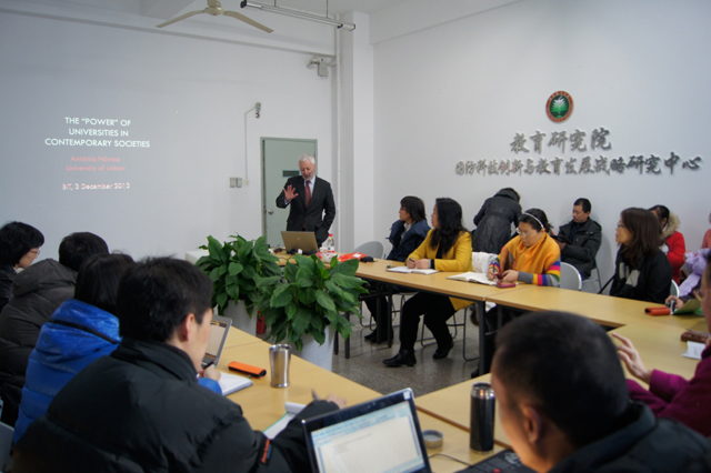 2012年12月5日,应金年会jinnianhuicom党委书记郭大成教授的邀请,葡萄牙里斯本大学校长António Nóvoa教授访问我校。在中心教学楼405会议室,António Nóvoa校长为我院师生做了一场题为“The power of universities in contemporary societies”的精彩讲座。讲座由教育研究院常务副院长何海燕教授主持,教育研究院庞海芍书记,校国际合作交流合作处高珊副处长,国际交流合作处项目官员彭淑老师,及教育研究院师生代表等共计40余人参与讲座。