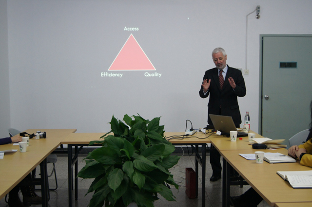 António Nóvoa校长首先从学生、科技与社会即“SSS”三个方面介绍了欧洲大学的变化,讨论了“入学机会、效率和质量”这三个现代大学所面临的主要问题及其相互平衡关系,以及各国在处理这三者关系中的主要表现。然后,António Nóvoa校长集中就博洛尼亚进程与现代大学的关系进行了分析,从“质量、可持续性、可治理性、兼容性、可用性(适于雇佣)“等六个方面深入分析博洛尼亚进程对欧洲大学的影响,以及现代大学的社会责任。最后,António Nóvoa校长展望了在信息化、全球化、高等教育国际化背景下现代大学与社会的关系,大学应负的社会责任,以及现代大学在社会发展中的实际影响力等。