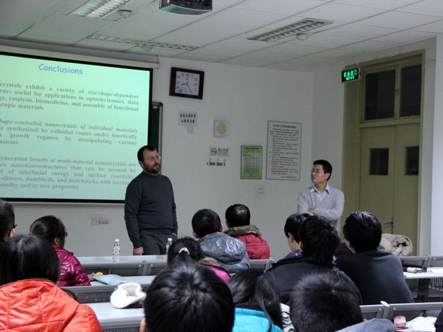 鉴于Cozzoli教授在纳米化学领域作出的突出性成绩,我们于12月5日晚6:30-8:00在研究楼409邀请Cozzoli教授给材料学院及相关研究领域的其他院系研究生讲了一次题为:“Development of Advanced Colloidal Nanocrystals: Crystal Structure, Size, Shape and Topology Control”的纳米化学科普性研究生课,报告从量子点、金属纳米晶的制备及原理到异质复合纳米结构的制备及原理,以及其在生物、光学、电学等方面的应用进行了细致的讲解,同学提问了很多关于纳米科技前沿的问题,互动热烈,学生反响很大,尤其是本校的国际研究生更是希望以后多搞此类外国专家的英文授课。