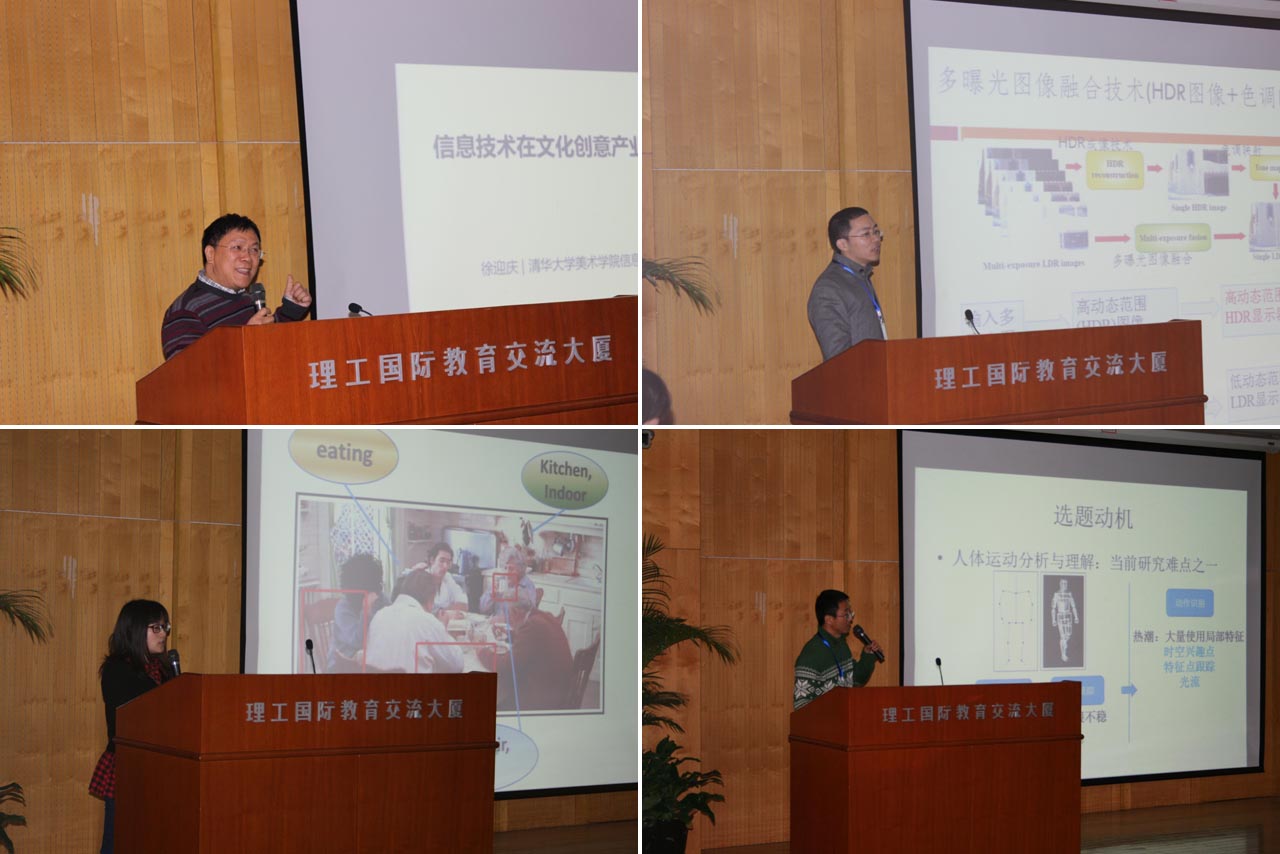 会议特别邀请清华大学信息艺术设计系主任徐迎庆教授做了题为“信息技术在文化创意产业中的应用”的大会报告,徐教授艺术性的演绎了计算机在现代文化创意中的引领作用,以及通过计算将科学与文化进行艺术再现的现代计算思维,得到与会代表非常热烈的反响。计算机学院优秀青年教师吴心筱博士、邸慧军博士、沈建冰博士分别做了“复杂场景中人的行为表示与识别”、“广义弹性运动跟踪与自动变形体建模”、“计算摄影的若干关键技术研究”的大会特邀报告,他们都在国际顶级期刊和顶级会议上发表过多篇高水平学术论文。研讨会共有46篇学术论文进行了展示报告。