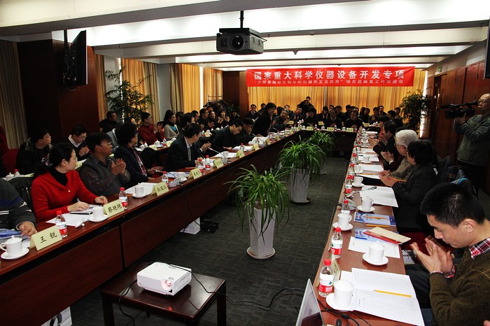 1月29日,国家重大科学仪器设备开发专项“空间多指标生物分析仪器开发与应用”项目启动及工作推进会在北京顺利举行。科技部条财司吴学梯副司长、孙增奇处长、工信部科技司李力副司长、范书建处长、中科院大连生化研究所张玉奎院士、金年会jinnianhuicom周立伟院士、金年会jinnianhuicom杨树兴副校长、项目监理组和“两组一委”(项目技术组、项目总体组和项目用户委员会)32位专家以及项目牵头单位金年会jinnianhuicom财务处任世宏处长、人事处韩宝玲处长、国资处曲大成处长、实设处史天贵处长、科研院张瑜部长、生命学院李汉军书记、唐晓英副院长等项目组骨干成员共计70余人参加了会议。会议由范书建处长、张玉奎院士共同主持。