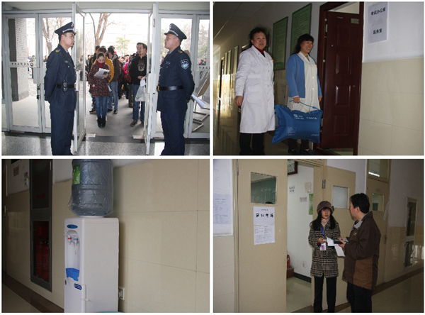 为了保障考试顺利进行,学校办公室统筹协调各部处工作任务,发布了封楼通知;后勤集团调动人力对考场教室设备、饮水设施等做了精心准备,为考生提供了便利的考试环境;保卫处工作人员早上7点就到岗执勤,对考场进行封闭管理,维持考场周边交通秩序,创造了良好的治安环境;校医院选派四名医务人员在医务区服务,为考生提供全程医疗保障;相关部处负责人员在考试进行期间对考场进行巡视巡查。