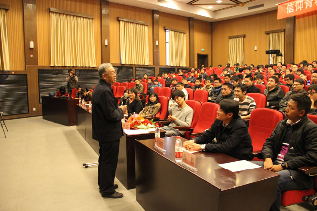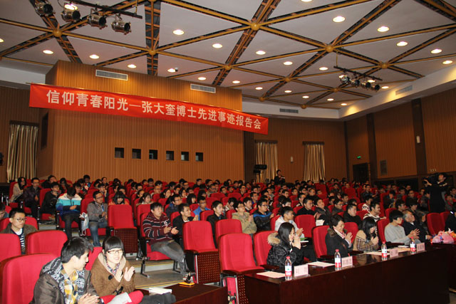 2013年3月29日下午4点,由计算机学院主办的"信仰·青春·阳光"张大奎博士先进事迹报告会在七号楼报告厅隆重举行。青年励志榜样张大奎博士,其导师樊孝忠教授,学校党委宣传部,学生工作处,校团委和计算机学院的领导、老师出席了会议,来自全校各个专业的200余名同学认真听取了报告。