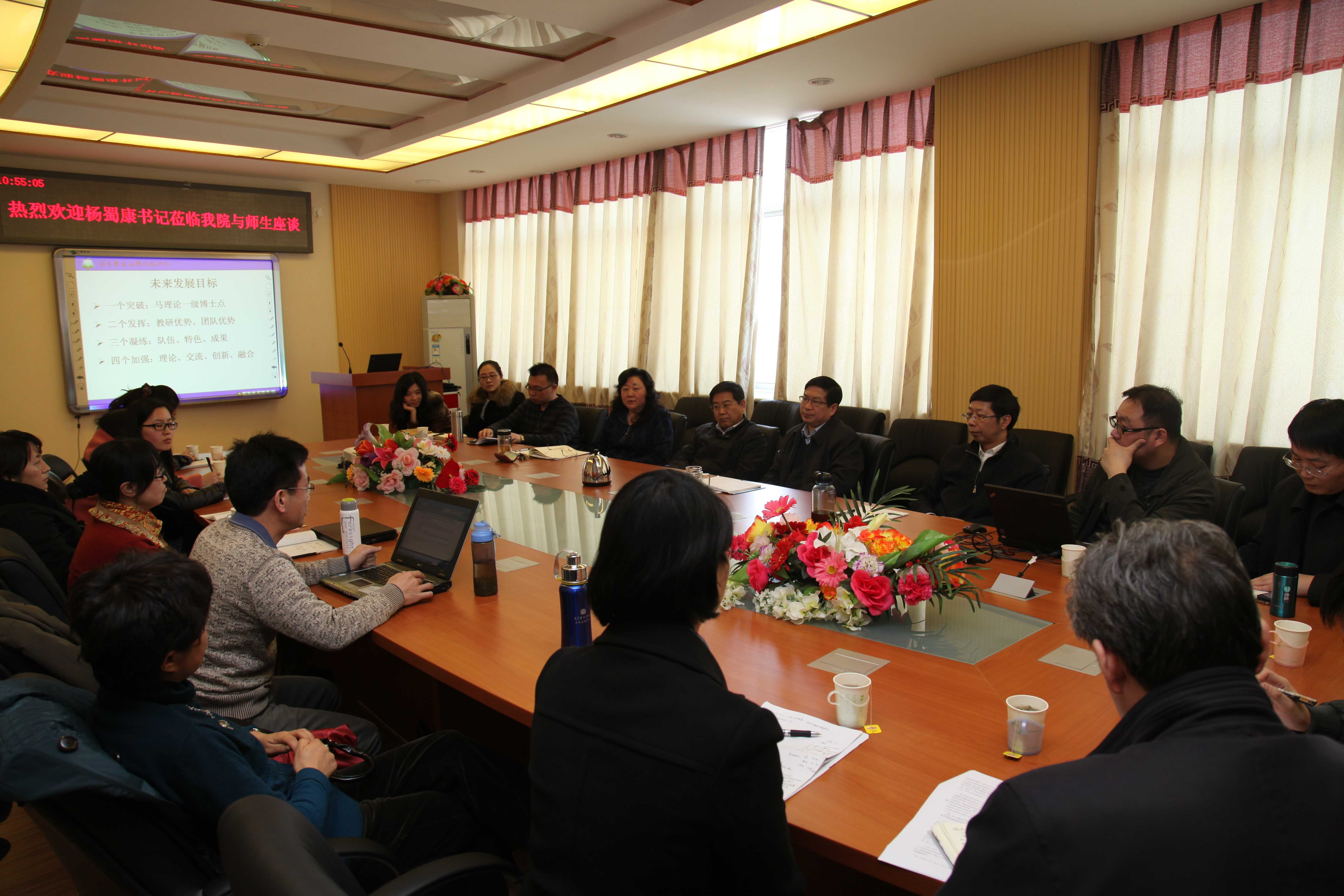 2013年4月3日,校纪委书记杨蜀康与马克思主义理论教研部教师就我校马克思主义理论学科发展与建设等问题在中心教学楼1318会议室进行座谈。马克思主义理论教研部主任张红峻、常务副主任李林英以及五个二级学科的负责教师和青年教师代表、硕士研究生参加了座谈会。
