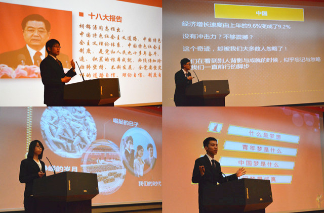 首先上场的是09级本科信息安全党支部的王子实同学,他用大量的案例生动地阐述了“从自信到自思”这一主题,思路清晰,论证充分,以独特的视角分析了一个个值得我们深思的问题,告诫同学们遇事要自信地冷静思考和独立判断。只有每个中国人都自信,中国才能自信。09级本科软件工程二班党支部的杨易寰同学同样以“三个自信”为主题,通过国家应对经济危机的举措及近年的发展成就,反映出我们的制度和道路的正确性、先进性和优越性,诠释了“三个自信”的内涵,提醒大家在各种不良思潮的冲击下,要明辨误区,正视中国。作为青年学子,要对国家、对自己胸怀自信,坚守前行。10级本科软件工程二班党支部的王诗雨同学以时间为线索,阐述了理想的力量这一主题。榜样的力量是无穷的,在峥嵘的岁月里,他们的理想是建设新中国,在崛起的日子里,他们的理想是实现中华民族的伟大复兴。而作为新时代的我们,则应乘着理想的翅膀翱翔,搏击长空,用奋斗留下无悔的青春回忆。最后上场的是12级硕士三班党支部的任广兴同学,他今天要为大家“解梦”。他的党课主题鲜明,形式丰富,自始至终都非常注重与同学们的互动,带领大家思考“什么是梦想”、“我的梦想”、“青年梦”与“中国梦”,一段颇有震撼力的视频展示更是令人印象深刻。他指出,“中国梦”是“三部曲”的世纪梦,实现“中国梦”必须凝聚力量,做到“三个共享”。作为北理工软件学子,我们应沿着学校育人目标和学院锅炉房精神为我们指引的筑梦之路而努力,践行我们自己的“中国梦”。