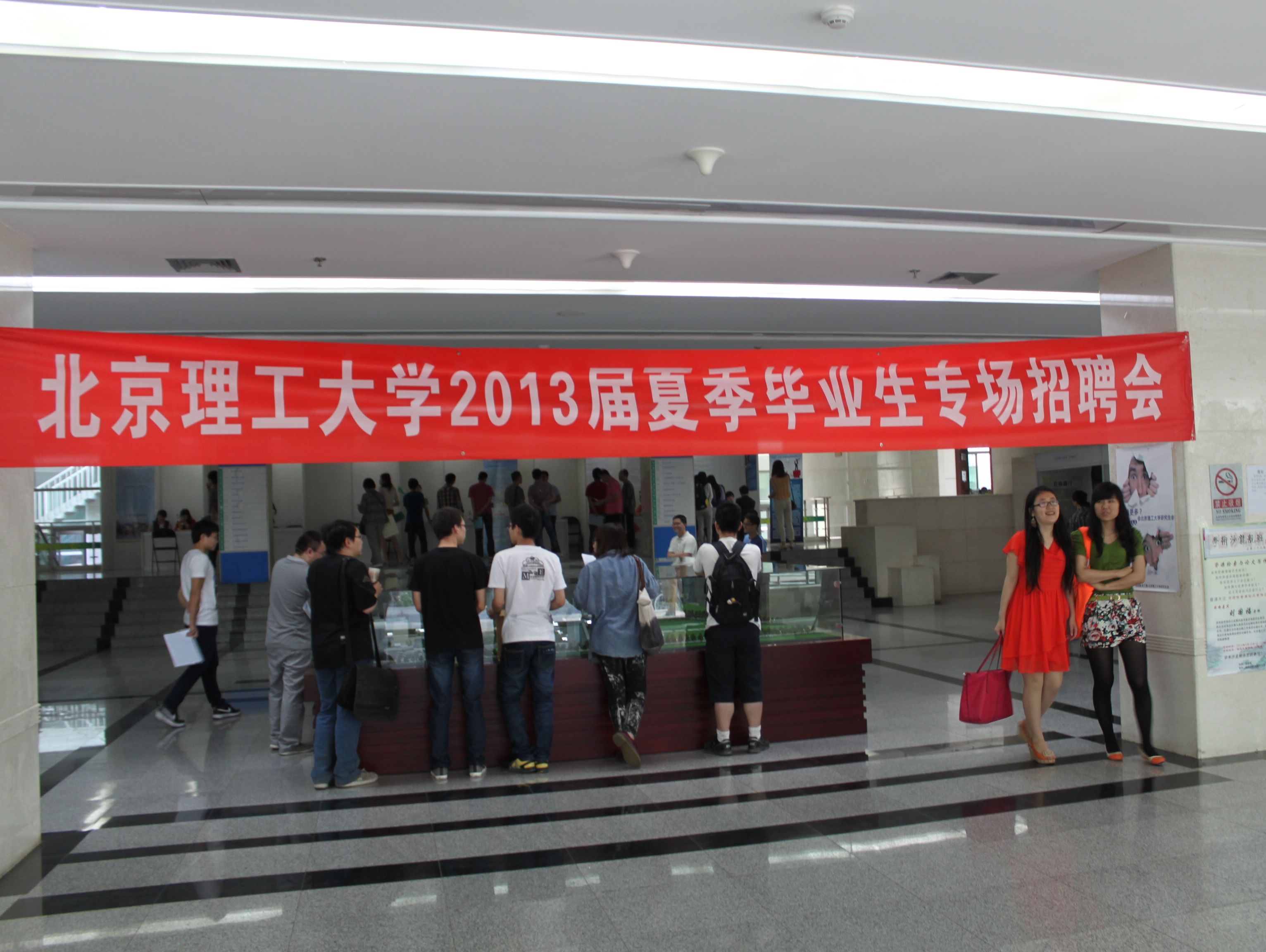 2013年5月16日,我校在体育馆南厅举办了“2013届夏季毕业生专场招聘会”。此次招聘会主要面向仍未落实就业去向的2013届毕业生。共有包括北京同仁堂科技发展股份有限公司、北京天海工业有限公司、阳光凯讯科技有限公司等22家企业参会,多为在京高新技术企业,提供了约300个就业岗位。