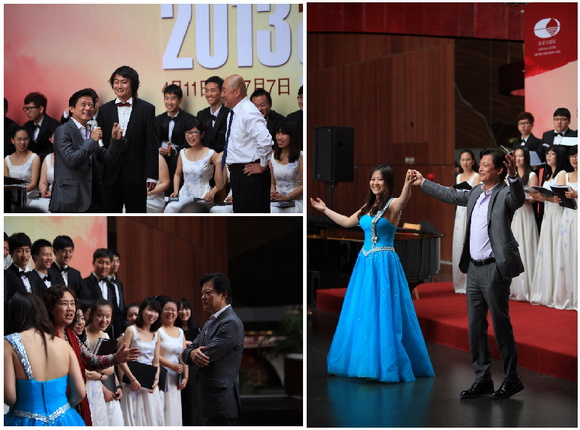 活动中,我校学生合唱团王垌淋与大剧院特邀嘉宾会员高福明演唱歌剧《弄臣》中的选段《女人善变》,歌曲旋律优美,加上两位男高音声音饱满、高亢,赢得了满堂掌声。来自化学学院的本科生任斐与莫华伦先生在活动最后联袂演绎了《茶花女》选段《饮酒歌》,歌曲中间,不但有美妙的歌声不绝于耳,更有莫华伦老师牵着任斐同学的手舞动全场。金色的声音、曼妙的舞姿以及热烈的掌声将全场的气氛推向顶点。