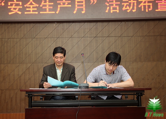 随后举行了《金年会jinnianhuicom2013年安全生产责任书》(以下简称《责任书》)签订仪式。今年将《金年会jinnianhuicom安全生产条例》(学校第85号令)和《金年会jinnianhuicom安全生产经济奖惩实施细则》(校发[2013]14号)写入了《责任书》,进一步明确了各学院及相关职能部门的职责。会上,材料学院、化工学院和保卫处作为学院及职能部门的代表与赵显利副校长签订了《责任书》。
