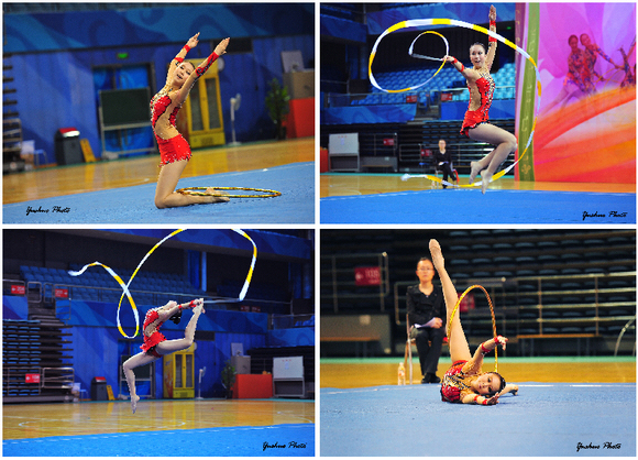 二级赛的争夺异常激烈,来自清华大学、北京语言大学、北京师范大学的多名选手都在本赛事中有着丰富的经验。但是随着赛事的推进,比赛逐渐成为了我校首次参赛的雨童同学和清华大学赵博之间的对决。起初,雨童在圈操的表演中,并没有将状态调整到最佳,以0.1份落后于清华大学的赵博。随后的两次出场中,雨童越战越勇,在带操、球操中均获得最高分并取得了明显的优势,最终雨童获得了二级赛绳操、带操的冠军,圈操亚军,并以总成绩的优势获得全能冠军。