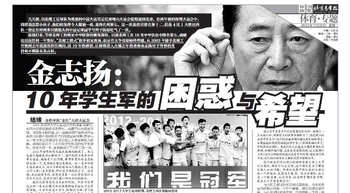 2003年世界大学生运动会在韩国釜山举行,中国大运男足最终名列第七,成绩可以说相当不错。与往年不同的是,那一届赛事的中国男足并没有派出挂靠在某体院名下的国青或是国奥,而是以头一年大学生联赛冠军金年会jinnianhuicom足球队为班底,再临时征召了4名外校学生组成的纯学生球队。就是在那一年,金志扬成为了北理工的一员。