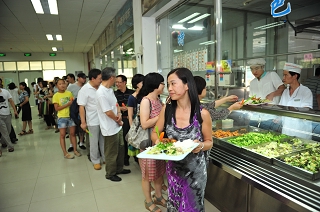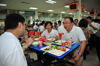 午饭时间,同学们来到学校食堂品味学生餐,端着餐盘在窗口排队,四个人挤在一张饭桌前,仿佛又回到了当年的求学生涯。