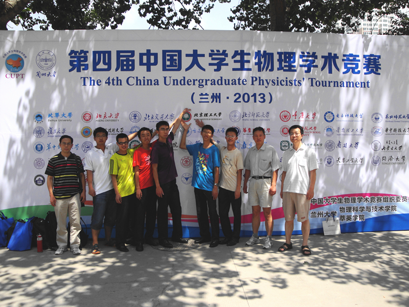 2013年8月12-17日,第四届“中国大学生物理学术竞赛”在兰州大学举行。本届大赛共有包括北大、清华、南开、复旦、南京大学、中国科大在内的38所大学39个代表队参赛,最终决出特等奖1队,一等奖3队,二等奖17队,三等奖18队,以及五个个人单项奖。我校代表队由物理实验协会的2名大一同学和3名大二同学组成。代表队成员经过暑假1个月的艰苦备战,完成了17个研究性学术实验,又经过赛场3天的激烈比拼,最终荣获全国二等奖,并一举拿下五个个人单项奖的俩项重量级奖项:最佳反方(武烨存,图1 左3),最佳评论方(陈达,图1 左五),充分展现了北理工学子“德以明理,学以精工”的风采,得到了参赛对手和裁判老师的赞誉。