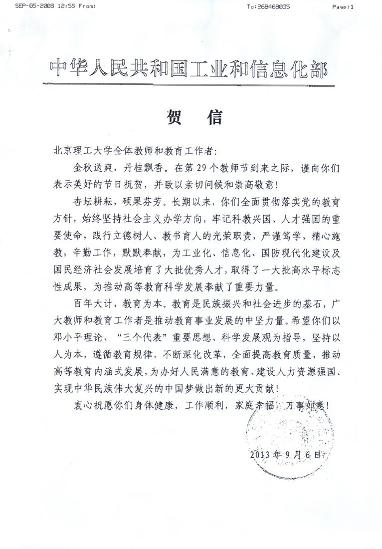 工信部致我校全体教师和教育工作者教师节贺信