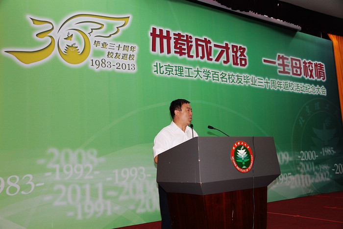 党委书记郭大成致欢迎辞。郭大成指出,校友是一所大学的形象名片,是学校最宝贵的资源,是学校发展最重要的依托。1983届校友在毕业的30年中,活跃在各行各业、各个领域,在各自的工作岗位上取得了让人骄傲的成就,为国家发展和社会进步做出了突出贡献,是母校的骄傲和荣耀。郭大成从学科建设、师资建设、人才培养、科学研究、文化传承等方面,向在座校友介绍了学校的最新发展情况和可喜成就,并感谢校友们长期以来对学校发展的关注和支持。最后,郭大成书记对各位校友及校友会办公室的同志提出了三点期望:一是弘扬延安精神,引领社会风尚。希望北理工人始终坚持和弘扬延安精神,不忘本色、不忘传统,把握时代潮流,引领社会风尚,不断走在社会发展的前列。二是凝聚校友力量,支持母校建设。希望校友们集资、集力、集智、集心,继续支持母校发展,把对母校的热爱和眷恋,构成北理工人强大的凝聚力,让母校变得更加美好。三是加强校友服务,促进校友发展。希望校友会办公室在服务校友中发挥更大的作用,让各位校友在北理工大家庭的怀抱中,感受到温暖、感受到力量、感受到成长。