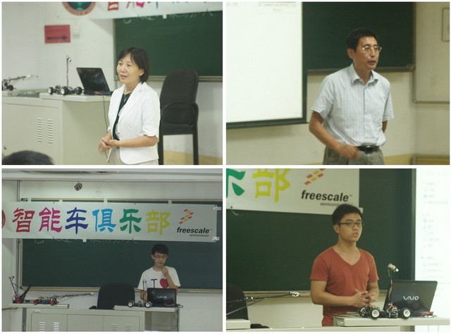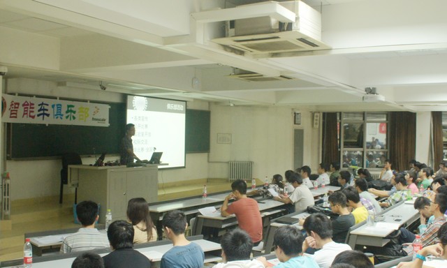 本次宣讲会由第九届智能车俱乐部主席王震主持,活动主要分为两个部分。在第一部分中,首先由第八届智能车俱乐部主席张成春同学为大家介绍了历届智能车俱乐部的发展,汇报了俱乐部组织同学代表我校学生参加第八届大学生智能车竞赛的情况。之后,智能车俱乐部三位指导教师对同学们参加竞赛提出了要求和应该注意的事项,进行了第九届比赛的组队动员。曹峰梅、廖晓钟、王泰鹏三位老师分别讲话,表达了对我校智能车竞赛项目的大力支持和殷切希望,让智能车爱好者都感到信心倍增。