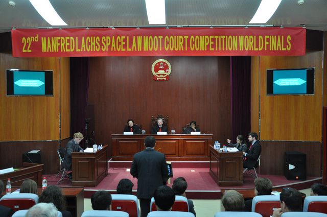 Manfred Lachs国际空间法模拟法庭比赛”是国际空间法学会举办的年度性世界级模拟法庭大赛,比赛语言为英文,是世界三大模拟法庭竞赛之一。2013年世界总决赛是欧洲赛区和北美赛区的冠军代表队的角逐,由于双方都具备不俗的实力,选手们各具特色,带队老师和代表都投入了极大的心力,使得本次比赛空前精彩。双方代表的表现均受到法官们的好评,依靠缜密的逻辑和灵活的应答,北美赛区略胜一筹,而欧洲赛区代表队在比赛中以其语言优势,在法庭陈述环节展现了高超的水准,同时凭借敏捷的思维,在应对法官问题、法庭辩论环节毫不逊色。最终,北美赛区代表队凭借优异的表现获得冠军。