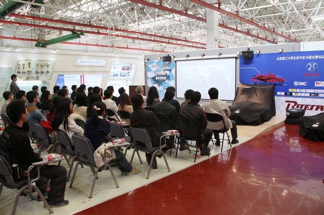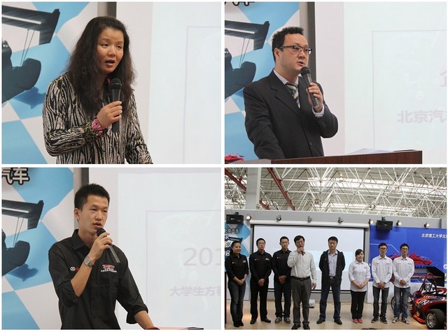 本届赛车队队长、我校车辆工程专业2009级本科生倪俊介绍了团队最近一年来的工作情况,向与会观众展现了这个获得多项荣誉、经历诸多挫折的学生团队如何做到了精神的传承、技术的传承和冠军梦想的传承。冠名企业代表、北京汽车商品企划部副部长陈思英在讲话中表示了对同学们的肯定与支持,并表达了校企双方携手再创佳绩的信心。指导教师王震坡、徐彬分别发言,并带领学生们以宣誓的形式表达了建设好队伍、培养好人才、取得好成绩的意念。
