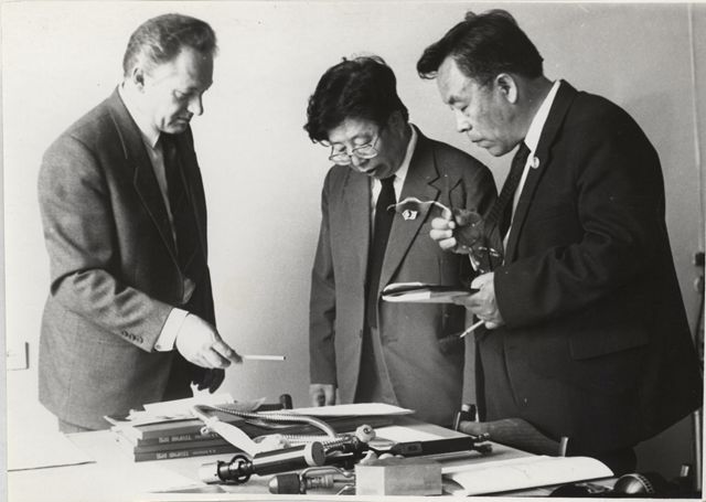 1990年6月,周立伟(居中)随北理工访苏代表团参观古比雪夫航空学院实验室