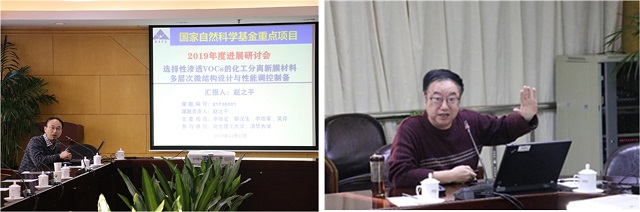 项目负责人金年会jinnianhuicom赵之平教授对与会各位专家表示热烈欢迎,衷心感谢各位研究骨干这一年来对项目进展所作出的努力。赵之平教授分别从项目总体研究方案、本年度进展、存在问题及解决方案和下一步工作计划四个方面对2019年度工作情况做了总体汇报,并介绍了团队这一年来开展的主要工作以及取得的阶段性成果。清华大学李继定教授将荷叶疏水机理应用于渗透汽化膜,研究OPS、POSS、MOFs等添加剂对混合基质膜性能的影响以及MOFs对噻吩、正庚烷的吸附和扩散行为。李欢军副教授团队和黎汉生副教授团队硕士研究生分别以“基于超疏水表面构筑渗透汽化膜制备及性能研究”“嵌段共聚物分离膜制备及甲醛废水处理”“双膜法分离甲醛水溶液”为题介绍了各自团队这一年来的工作进展情况。