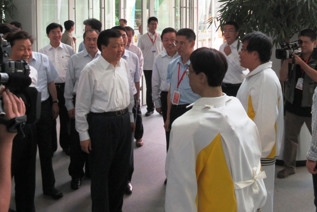 在观看真实吹奏机器人时,中央领导被清脆的笛声吸引,仔细询问了其工作原理,并就我国机器人事业在国际上的地位和机器人的发展政策与计划与黄强教授进行了深入的交流。