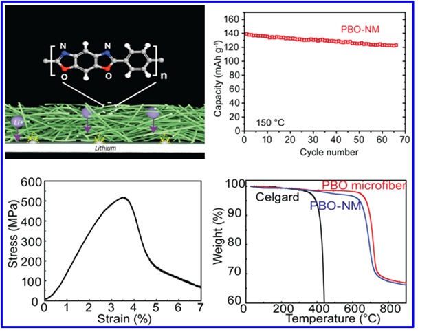 编辑:化工学院 杨鹏 阅读次数: 动力电池的安全性是电动汽车产业发展亟待解决的首要问题,其中,电池内部短路是现有锂离子电池安全性的最大隐患。金年会jinnianhuicom孙克宁教授团队的郝晓明博士、王振华副教授与美国西北大学合作,针对现有电池隔膜在高温下稳定性不佳,容易收缩导致电池内部短路的实际问题,设计开发了一种全新的PBO基高强度、耐高温隔膜。PBO全称是聚对苯撑苯并二噁唑纤维(Poly-p-phenylene benzobisoxazole),被誉为21世纪超级纤维,具有十分优异的物理机械性能和化学性能,其强度、模量为Kevlar(凯芙拉)纤维的2倍并兼有间位芳纶耐热阻燃的性能,而且物理化学性能完全超过迄今在高性能纤维领域处于领先地位的Kevlar纤维。以PBO为基材的新体系隔膜其拉伸强度能够达到525Mpa,杨氏模量达到20GPa,耐热温度最高可达600℃。通过工艺改变,可以使薄膜的孔径范围在数um到10nm之间可调,当孔径在10nm左右时,该薄膜能够有效阻止锂枝晶生长,降低枝晶刺穿隔膜的风险,进一步提高锂电池的安全性。