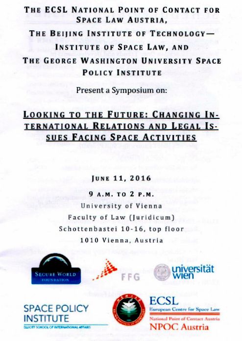 2016年6月11日,我校空间法研究所与乔治华盛顿大学空间政策研究所在维也纳联合举办题为“面向未来:变化中的国际关系和空间法问题”国际学术会议。参加本次大会的有来自美国、俄罗斯、奥地利、日本、德国等20多个国家的60位有关空间法律与政策的专家和政府官员。我国外交部参加联合国外空委第59届会议的代表团成员也参加了会议。会议由欧洲空间法中心奥地利联系点维也纳大学法学院负责承办。