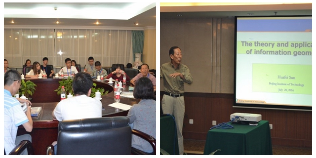 本次会议涉及主题包括信号与图像处理、信息几何理论及其应用、最优化理论及其应用、非线性微分方程的边值问题等4个议题。邀请了国内外6位知名专家学者做大会邀请报告,其中包括郭柏灵院士的“Global Finite Energy Weak Solution to the Viscous Quantum Navier.Stokes.Landau.Lifshtz. Maxwell Model in two Dimension”、美国Wisconsin大学 Amir Assadi 教授的“Information Geometry and Topological Methods in Brain Research”、新加坡国立大学Defeng Sun教授的“Second Order Nonsmooth Techniques for Big Sparse Optimization Models”、捷克共和国Lepage Research Institute Demeter Krupka 教授的“Recent Trends in the Inverse Problem of the Calculus of Variations”、意大利Politecnica delle Marche大学Simone Fiori教授的“Differential-geometrical Methods in Complex Motion Data Analysis”,以及来自中国科学院大学Tiande Guo教授的“Data Representation---From Human Brains Perceive to Deep Learning”。