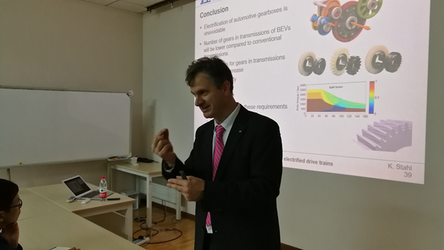 近日,德国慕尼黑工业大学机械系教授、德国齿轮研究中心(FZG)主任Karsten Stahl教授访问机械与车辆学院并开展学术交流活动。访问期间,Stahl教授做了题为“On the future of gear in electrified drive trains”的学术报告。Stahl教授重点介绍了齿轮传动在当代乘用车的应用,在此基础上介绍了电动车所用齿轮传动,设计方法,齿轮在电动车中应用的必要性,存在的问题、发展趋势,特别是结合与世界著名车企BMW合作进行电动车研发过程中齿轮传动所要解决的功率密度问题、效率问题和噪声的问题。Stahl教授报告内容丰富,讲述生动,引起了与会师生的浓厚兴趣,同学们就报告内容进行了深入讨论。通过相关领域国际前沿知识的介绍,有助于拓展研究生的国际视野、夯实专业基础、提高专业学习兴趣。