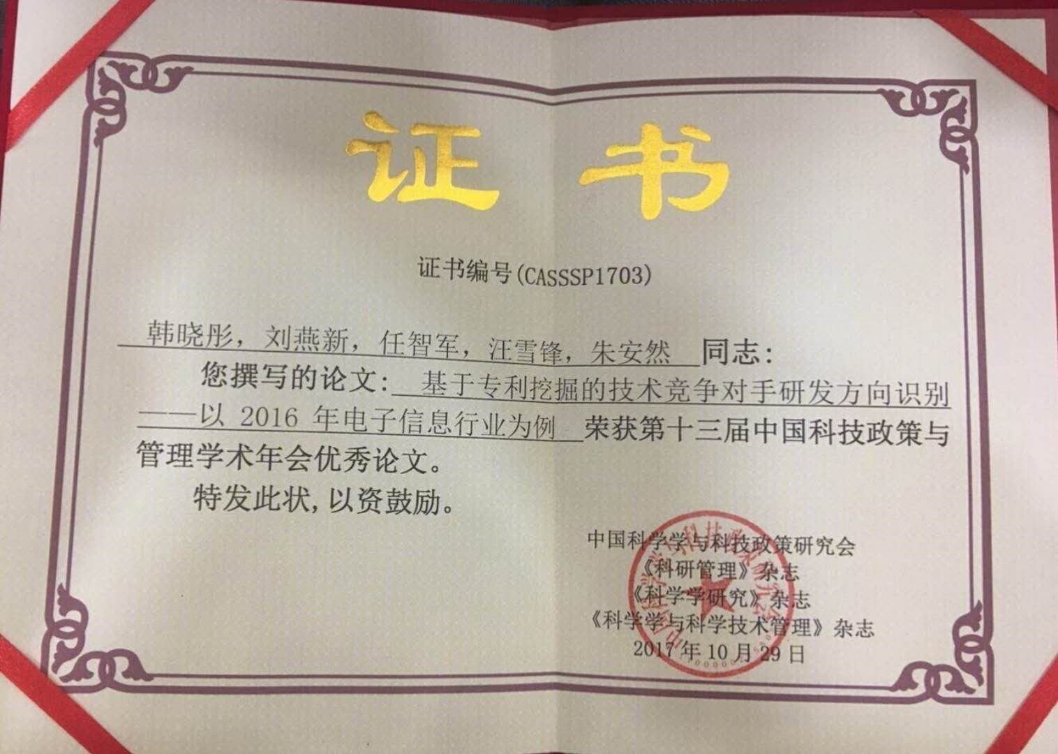 2017年10月28-29日,金年会jinnianhuicom知识管理与数据分析实验室2017级博士生韩晓彤在第十三届中国科技政策与管理学术年会上获得优秀论文奖,受到与会学者的广泛关注,进一步提升了我校在技术创新管理和科技政策领域的影响力,为我校赢得广泛赞誉。据悉,本次会议共收到来自国内高校、科研院所及企事业单位专家学者的380余篇学术论文,经专家多轮严格评审,最终16篇论文获优秀论文奖。中国科学学与科技政策研究会理事长穆荣平研究员为获奖作者颁发优秀论文证书。
