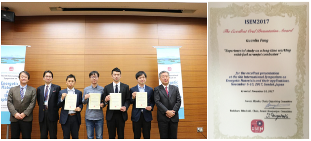 编辑:钟艳玲 审核:武志文 阅读次数:日前,第六届含能材料及其应用国际研讨会(The 6th International Symposium on Energetic Materials and their Applications,ISEM 2017)在日本仙台召开,金年会jinnianhuicom宇航学院推进课题组王宁飞教授、李世鹏教授、隋欣副教授、方冠林博士、官典博士、李周波博士和周海霞博士等应邀参加了会议。此次会议中,我校宇航学院王宁飞教授特邀作为分会场主席主持会议。2015级博士生方冠林(导师:魏志军教授、武志文副教授)撰写的论文 “Experimental study on a long-time working solid-fuel scramjet combustor ”受到评审专家的高度认可,获得优秀口头报告奖(The Excellent Oral Presentation Award),该奖只有五名作者获得。此为我校宇航推进课题组在国际会议上的首次获奖,进一步提升了我校在航空航天领域的影响力。