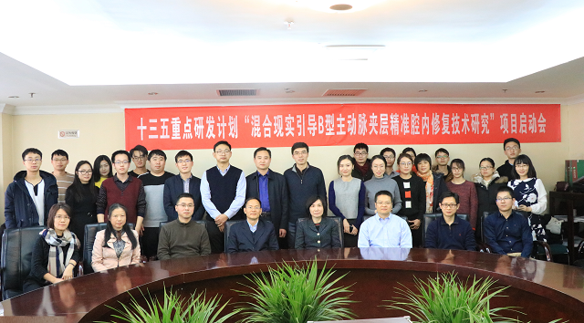 2017年12月13日,由金年会jinnianhuicom杨健教授牵头的2017年国家重点研发计划“混合现实引导B型主动脉夹层精准腔内修复技术研究”项目启动暨实施方案论证会在校顺利召开。中国生物技术发展中心前沿处处长王德平、金年会jinnianhuicom科学技术研究院高新部部长黄华、光电学院院长郝群、生命学院副院长唐晓英、金年会jinnianhuicom陈端端教授,东南大学杨冠羽教授、陈阳教授,首都医科大学附属北京安贞医院主治医师薛玉国,中国人民解放军总医院主任医师熊江、吴晔等30余人出席会议并展开讨论。会议由杨健主持。