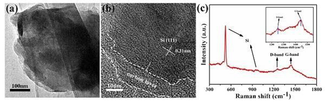(a) Si/C纳米片的TEM;(b) Si/C纳米片的HRTEM;(c) Si/C纳米片的拉曼光谱图。