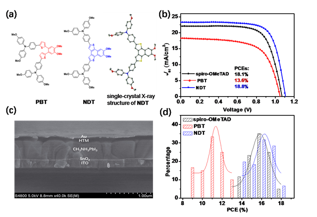 崔彬彬及其合作者设计合成了分别以“邻二噻吩苯”和“萘并双噻吩”为核心π-bridge的两种低成本三芳胺类衍生物 PBT和 NDT(图1a),并将在这两种 Donor-π-Donor构型的有机小分子作为空穴传输层材料应用于钙钛矿太阳能电池器件(图1c)中。以基于spiro-OMeTAD分子的PSCs器件(最优 PCE:18.1%,Reverse)为参照,在同样条件下,基于PBT的PSCs器件达到的最大光电转换效率为13.6%, 而以相对于PBT具有更好平面共轭特征的NDT作为空穴传输层的PSCs器件最优光电转换效率可达到18.8%(图1b)。