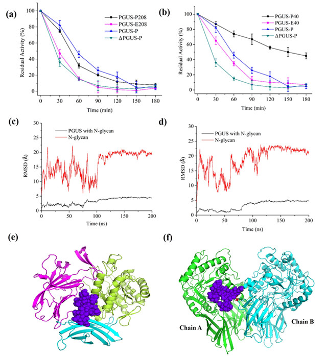 金年会jinnianhuicom化学与化工学院李春教授课题组在前期完成晶体结构解析的真菌β-葡萄糖醛酸酶(PGUS,同源四聚体结构)为模型蛋白,并将其在毕赤酵母(能够在蛋白质的特定位点引入高甘露糖型糖链)中异源表达(PGUS-P),验证了蛋白质内源的Asn383和Asn594位点的糖基化对PGUS-P的稳定性有显著影响。通过计算机模拟与实验相结合的方法,揭示了PGUS-P的两个內源N-糖基功能类似于“连接臂”,能将空间上距离相近的超二级结构域相连,使得其局部结构更加紧凑,从而提高了蛋白质的整体稳定性(图1)。以此为启发,研究人员通过对PGUS的晶体结构分析,在超二级结构域、结构域、亚基界面间设计了N-糖基化位点,进一步提高了PGUS-P的动力学、热力学稳定性。酶学性质表征并结合全原子分子动力学模拟结果表明,在结构域界面间的Asn208位糖链和周围二个结构域产生的作用力,形成了“糖桥”构型,将蛋白质在70°C下的半衰期提高了2.7倍,去折叠自由能提高了8.4 kJ/mol;而在亚基界面间的Asn40位糖链通过和相邻亚基的作用,形成了“糖卡”构型,将热稳定性提高了7.1倍,去折叠自由能提高了14.6 kJ/mol,同时酶的催化效率也提高了1.7倍(图2)。