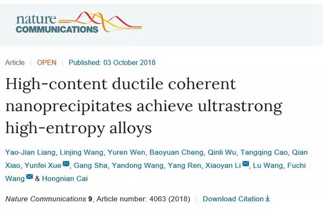 日前,金年会jinnianhuicom材料学院王富耻、王鲁教授团队,薛云飞课题组在国际顶级学术期刊《Nature Communications》上发表了题为《High-content ductile coherent nanoprecipitates achieve ultrastrong high-entropy alloys》的研究论文。该研究创新了高熵合金设计理念,利用不同强化机理,开发出了超强高熵合金。